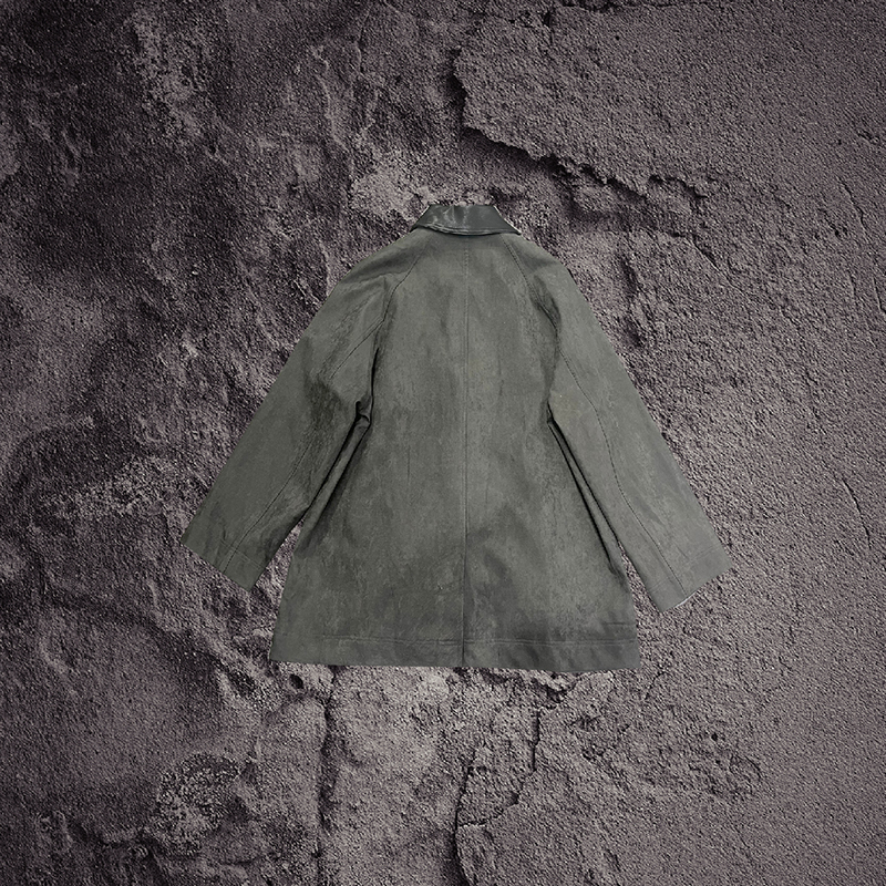 Описание: «Шёпот серого тумана» — элегантная куртка из сверхтонкой замшевой микрофибры серо-зелёного оттенка. Поверхность бархатистая, как дюны при лунном свете, на ощупь не оставляет следов. Воротник-стойка с контрастной вставкой из глянцевого чёрного кожзама мгновенно освежает лицо: поднят — холодный щит, опущен — изящное V-область. Реглан убирает линию плеча, дарит свободу движений и зрительно удлиняет силуэт. Планка на однобортных матовых смоляных пуговицах чёрного цвета: тихий люкс без лишнего блеска. Наклонные карманы скрыты в боковых швах под 18°, в них естественно ложится рука — поместится и телефон, и уверенность. Никакого декора: только игра фактур и пропорций, в духе 70-х, но в минималистичном прочтении. Длина до линии таза вытягивает пропорции: с джинсами клеш — французское кино, с атласной юбкой — вернисаж. Лёгкая, ветронепроницаемая: весной и осенью — сама по себе, зимой — поверх чёрного кашемирового свитера с высоким воротом, где кожа повторяет контраст. Одна куртка, два материала, три сценария: офис, выставка, вечерний бар. Незаметная — и всегда в центре внимания.